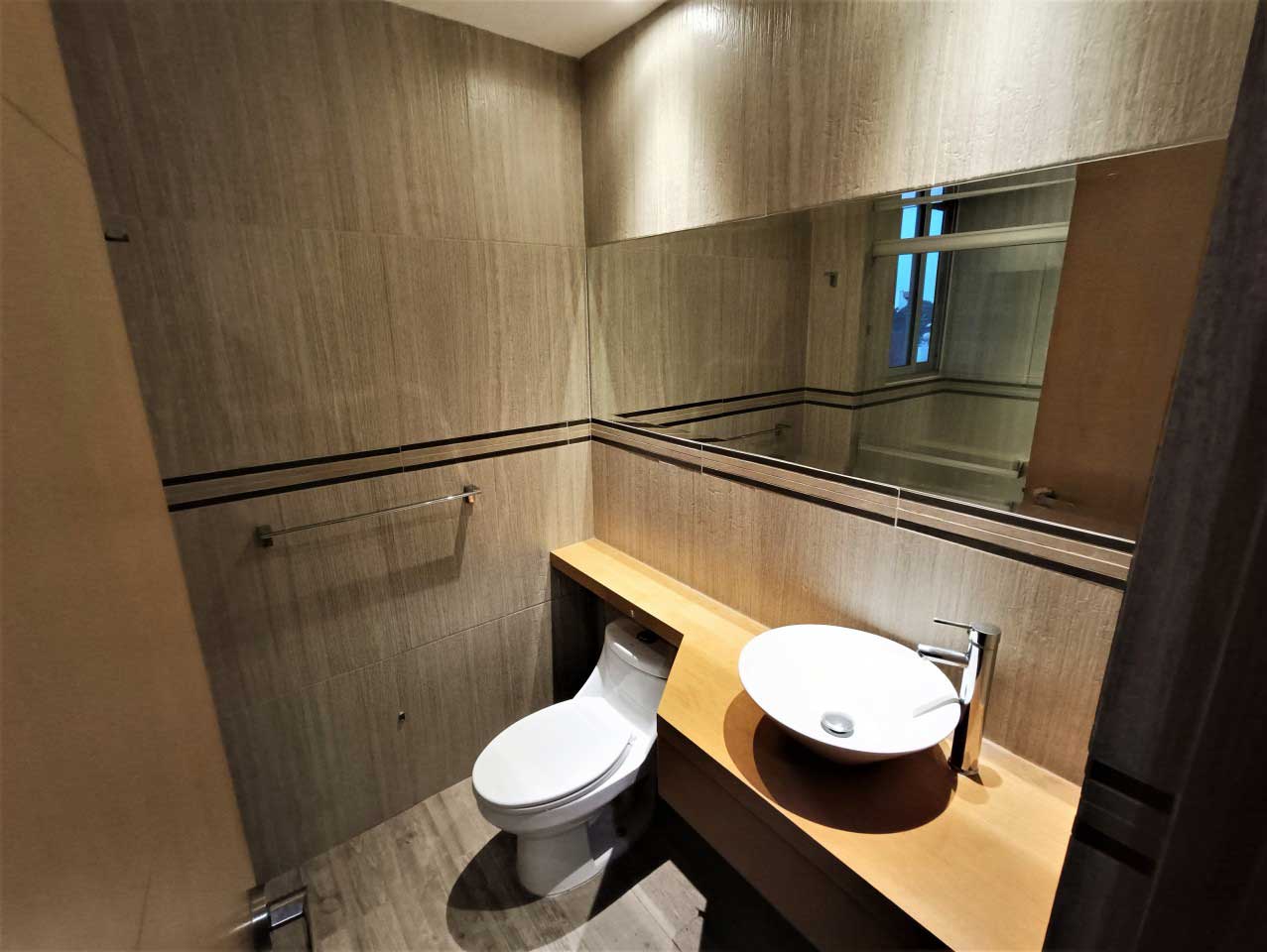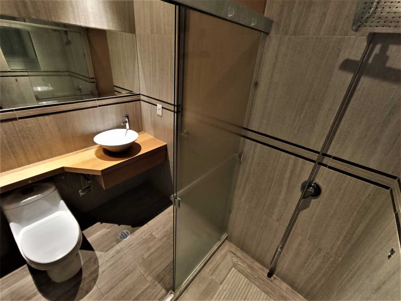 3 Baños completos equipados con accesorios, espejos, cancel de vidrio templado, cubierta de encino en lavabo,